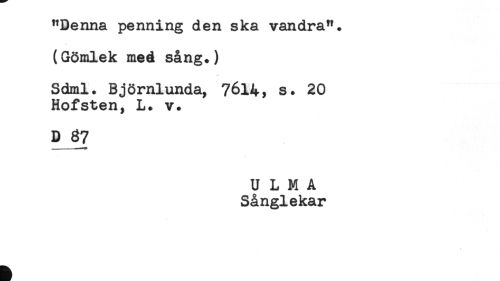 //// "Denna penning den ska vandra". //// (Gömlek med sång.) //// Sdml. Björnlunda, 7614, s. 20 //// Hofsten, L. v. //// D 67 //// U L M A //// Sånglekar ////