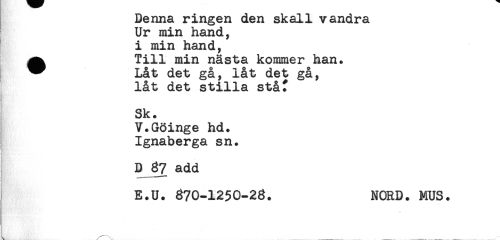 //// Denna ringen den skall vandra //// Ur min hand, //// i min hand, //// A Till min nästa kommer han. //// ^ Låt det gå, låt det gå, //// låt det stilla stå? //// Sk. //// V.Göinge hd. //// Ignaberga sn. //// D 8? add //// E.U. 870-1250-28. NORD. MUS. ////