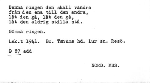 //// Benna ringen den skall vandra //// från d en ena till den andra, //// låt den gå, låt den gå, //// låt den aldrig stilla stå. //// Gömma ringen. //// Lek.t 1941* Bo. Tanums hd. Lur sn. Resö. //// B 37 add //// NORD. MUS. ////