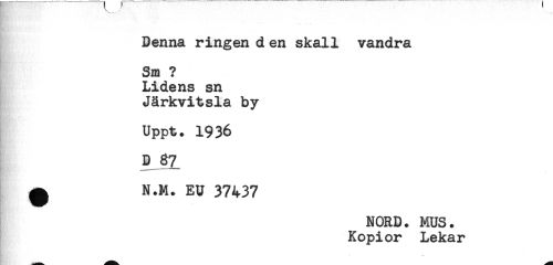 //// Denna ringen den skall vandra //// Sm ? //// Lidens sn //// Järkvitsla by //// Uppt. 1936 //// Hr ' ' t //// D 87 //// ^ N.M. EU 37437 //// NORD. MUS. //// Kopior Lekar ////