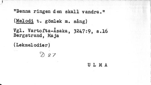 //// "Denna ringen den skall vandra." //// *< //// (Melodi t. gömlek m. sång) //// Vgl. Vartofta-Åsaka, 3247:9, s.16 //// Bergstrand, Maja //// (Lekmelodier) i //// i //// U L M A //// ) //// ' //// ! //// t ////