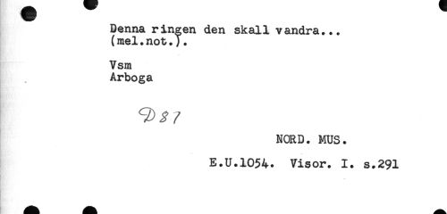 //// Denna ringen den skall vandra... //// (mel.not.J). //// * //// Vsm //// Arboga //// - //// NORD. MUS. //// E.U.1054. Visor. 1. s.291 //// ti ////