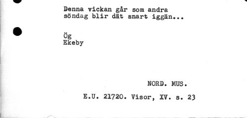 //// Denna vickan går som andra //// söndag blir dät snart iggän... //// ^ Og //// Ekeby //// i //// NORD. MUS. //// E.U. 21720. Visor, XV. s. 23 ////