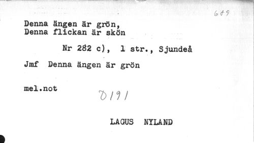 //// étf? ' //// Denna ängen är grön, //// Denna flickan är skön //// * .... .... //// Nr 282 c), 1 str., Sjundeå //// Jmf Benna ängen är grön //// mel.not , //// LAGUS NYLAND ////