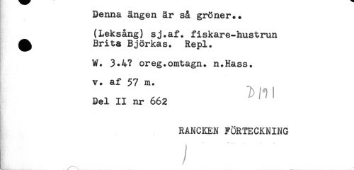 //// Denna ängen är så gröner.. //// (Leksång) sj.af. fiskare-hustrun //// ^ Brita Bjorkas. Repl. //// W. 3*4? oreg.omtagn. n.Hass. //// v. af $7 m. //// j ) I //// Del II nr 662 //// RANCKEN FÖRTECKNING ////