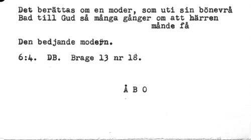 //// Bet berattas om en moder, som uti sm bönevrå //// Bad till Gud så många gånger om att härren //// månde få //// Den bedjande mode&n* //// 6:4* BB. Brage 13 nr 13. //// ÅBO ////