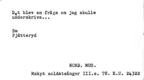 //// ! //// ! //// D@t blev en fråga om jag skulle //// underskriva... //// Sm //// Pjätteryd //// NORD. MUS. //// Mskpt soldatsånger III.s. 7%. E.U. 24322 ////