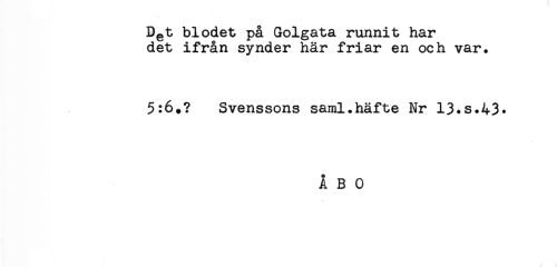 //// Dgt blodet på Golgata runnit har //// det ifrån synder här friar en och var. //// 5:6.? Svenssons saml.häfte Nr 13.S.43* //// ÅBO ////