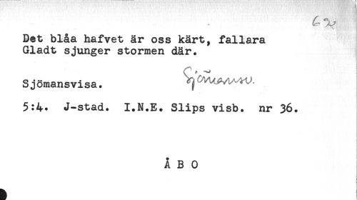 //// Det blåa hafvet är oss kärt, fallara //// Gladt sjunger stormen där. //// r , //// Sjömansvisa. //// 5:4. J-stad. I.N.E. Slips visb. nr 36. ////