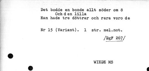 //// / - " - - *- - '** - - ' //// Det bodde en bonde allt söder om ö //// Och d en lilla //// Han hade tre döttrar och rara voro de //// [ //// HE'^' //// . //// Nr 15 (Variant). 1 str. mel.not. //// /DgF 267 //// /WIEDE MS ////