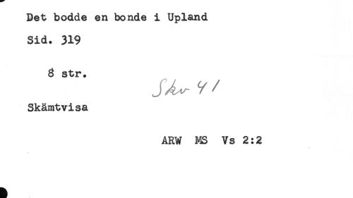 //// Det bodde en bonde i Upland //// Sid. 319 //// 8 str. //// Skämtvisa //// ARW MS Vs 2:2 ////