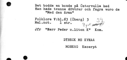 //// * Bet bodde en bonde på Östervalla hed //// Han hade tvenne döttrar och fagra voro de //// "Med den åran" //// Folklore V:bl.83 (Öberg) 3 //// Mel.not. 1 str. //// Jfr "Herr Peder o.liten K" Kom. //// DYBECK MS KVHAA //// - //// Er //// MOBERG Excerpt //// - ////