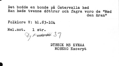 //// Det bodde en bonde på Östervalla hed //// Han hade tvenne döttrar och fagra voro de "Med //// den äran" //// Folklore V: bl.83-104 //// Mel.not. 1 str. //// DYBECK MS KVHAA //// MOBERG Excerpt ////