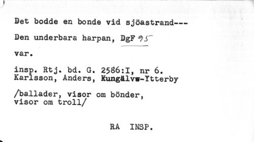 //// Det bodde en bonde vid sjöastrand--- //// Ben underbara harpan, DgF //// var. //// insp. Rtj. bd. G. 2536:1, nr 6. //// Karlsson, Anders, Kungaivw-Ytterby //// /ballader, visor om bönder, //// visor om troll //// /RA INSP. ////