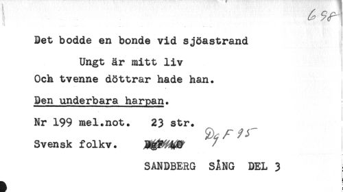 //// ii ....., .... //// Bet bodde en bonde vid sjöastrand //// Ungt är mitt liv //// Och tvenne döttrar hade han. //// Den underbara harpan. ^ //// Nr 199 mel.not. 23 str. //// Svensk folkv. //// /SANDBERG SÅNG DEL 3 ^ //// b ////