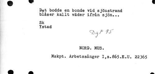 //// Det bodde en bonde vid sjöastrand //// blåser kallt väder ifrån sjön... //// Sk //// Ystad //// T), ^ //// NORD. MUS. //// - //// Mskpt. Arbetssånger I,s.365.E.U. 22365 ////