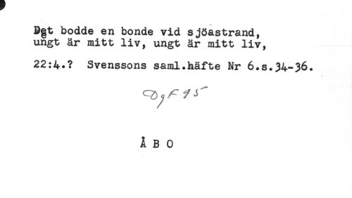 //// D^t bodde en bonde vid sjöastrand, //// ungt är mitt liv, ungt är mitt liv, //// 22:4.? Svenssons saml.häfte Nr 6.s.34-36. //// ÅBO ////