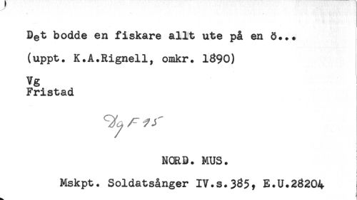 //// Det bodde en fiskare allt ute på en ö... //// (uppt. K.A.Rignell, omkr. 1890) //// Vg //// Fristad //// - //// NORD. MUS. //// Mskpt. Soldatsånger IV.s.3^5, E.U.28204 ////