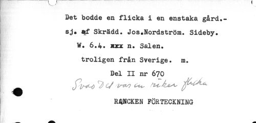 //// Det bodde en flicka i en enstaka gård.- //// sj. qf Skrädd. Jos.Nordström. Sideby. //// W. 6.4. xxx n. Salen, //// troligen från Sverige, m. //// Del II nr 670 //// ^ J ^ c/ ^ w ^ ^ ^ //// ROCKEN FÖRTECKNING ////