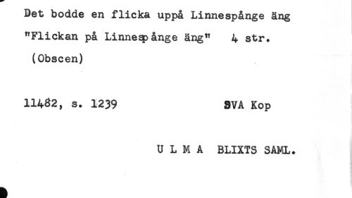 //// Det bodde en flicka uppå Linnespånge äng //// "Flickan på Linnespånge äng" 4 str. //// (Obscen) //// 11432, s. 1239 SVA Kop //// U L M A BLIXTS SAML. ////