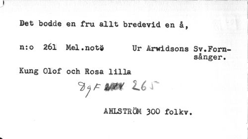 //// Det bodde en fru allt bredevid en å, //// ) //// ) //// n:o 261 Mel.nota Ur Arwidsons Sv.Forn- //// sånger. //// Kung Olof och Rosa lilla //// AHLSTRÖM 300 folkv. //// { //// i //// : ////