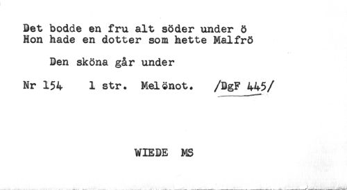 //// Bet bodde en fru alt söder under ö //// Hon hade en dotter som hette Malfrö //// Ben sköna går under //// Nr 154 1 str. Melönot. /BgF_445 //// /WIEBE MS ////