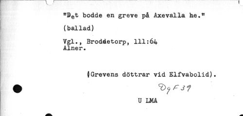 //// "Bet bodde en greve på Axevalla he." //// (ballad) //// Vgl., Broddetorp, 111:64 //// Alner. //// {Grevens döttrar vid Elfvabolid). //// U LMA ////
