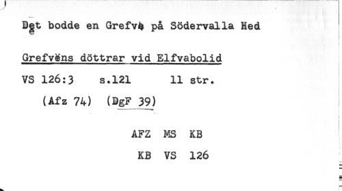 //// Dgt bodde en Grefv4 pa Södervalla Hed //// ! //// GrefvMns döttrar vid Elfvabolid //// VS 126:3 s.121 11 str. //// (Afz 74) (DgF 39) //// AFZ MS KB //// KB VS 126 ////