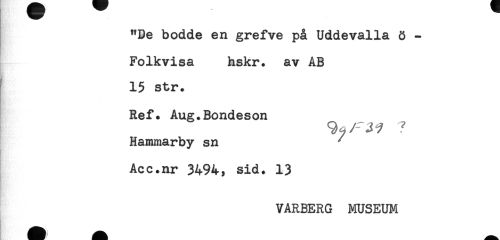 //// "De bodde en grefve på Uddevalla ö - //// Folkvisa hskr. av AB //// 15 str. //// Ref. Ang.Bondeson //// Hammarby sn ^ //// Acc.nr 3494, sid. 13 //// VARBERG MUSEUM ////