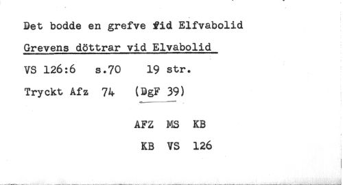 //// * //// Det bodde en grefve fid Elfvabolid //// Grevens döttrar vid Elvabolid //// VS 126:6 s.70 19 str. //// Tryckt Afz 74 (DgF 39) //// AFZ MS KB //// KB VS 126 //// t //// t //// s t //// ] ////
