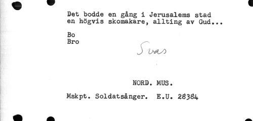 //// Det bodde en gång i Jerusalems stad //// en högvis skomakare, allting av Gud... //// Bo //// Bro //// J L^LX) //// NORB. MUS. //// Mskpt. Soldatsånger. E.U. 28384 ////