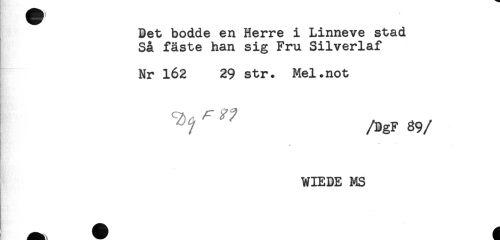 //// Bet bodde en Herre i Linneve stad //// Så fäste han sig Fru Silverlaf //// Nr 162 29 str. Mel.not //// ! ^ /DgF 89 //// /WIEBE MS ////