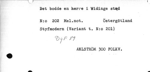 //// Bet bodde en herre i Widinge stqd //// * * //// Ei.:,.. //// N:o 202 Mel.not. Östergötland //// Styfmodem (Variant t. N:o 201) //// ^ „ f //// AHLSTRÖM 300 FOLKV. ////