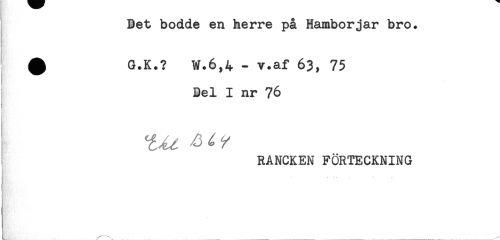 //// Bet bodde en herre på Hamborjar bro. //// ^ G.K.? W.6,4 - v.af 63, 75 //// Del I nr 76 //// RANCKEN FÖRTECKNING //// - .t ., . //// ; ////