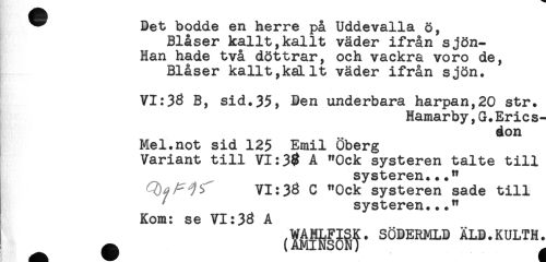 //// ^ Det bodde en herre på Uddevalla ö, //// Blåser kallt,kallt väder ifrån sjön- //// Han hade två döttrar, och vackra voro de, //// Blåser kallt,kåLlt väder ifrån sjön. //// VI:36 B, sid.35, Den underbara harpan,20 str. //// Hamarby,G.Erics- //// don //// Mel.not sid 125 Emil Öberg //// Variant till VI:3$ A "Ock systeren talte till //// systeren..." //// VI: 36 C "Ock systeren sade till //// systeren..." //// Kom: se VI:36 A //// .WAHLFISK. SÖBERMLB ÄLB.KULTH. //// ^ (AMINSON) ^ ////