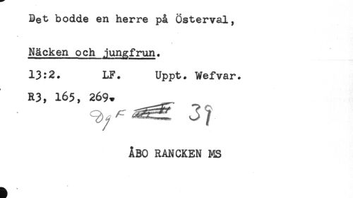 //// Bet bodde en herre på Österval, //// ** //// Näcken och jungfrun. //// 13:2. LF. Uppt. Wefvar. //// R3, 165, 269- //// ÅBO RANCKEN MS ////