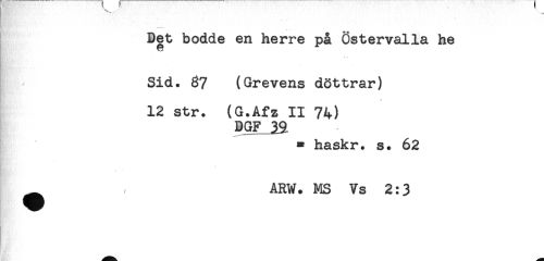 //// Bet bodde en herre på Östervalla he //// Sid. 37 (Grevens döttrar) //// 12 str. (G.Afz II 74) //// DGF 22 //// * haskr. s. 62 //// ARW. MS Vs 2:3 //// S& ; ////
