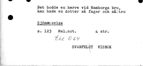 //// Bet bodde en herre vid Hamborga bro, //// han hade en dotter så fager och så2tro //// Sjöman svisa //// s. 123 Mel.not. 4 str. //// * //// * ? //// SVANFELCT VISBOK //// S ////