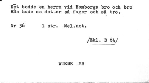 //// Bet bodde en herre vid Hamborga bro och bro //// Hän hade en dotter så fager och så tro. //// Nr 36 1 str. Mel.not. //// /Ekl. B 64 //// /WIEDE MS ////
