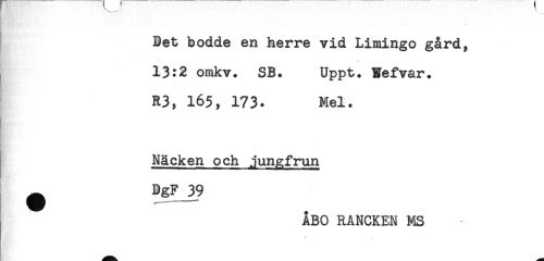 //// Det bodde en herre vid Limingo gård, //// . . //// 13:2 omkv. SB. Uppt. Nefvar. //// R3, 165, 173. Mel. //// ! //// Näcken och jungfrun //// ^ BgF _39 //// ÅBO RANCKEN MS ////
