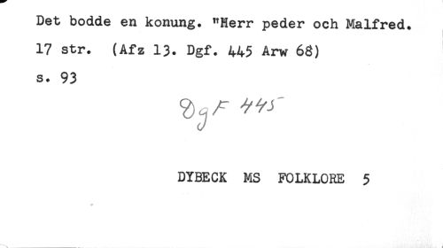 //// Det bodde en konung. "Herr peder och Malfred. //// 17 str. (Afz 13. Dgf. 445 Arw 63) //// s. 93 //// DYBECK MS FOLKLORE 5 //// ta* ////