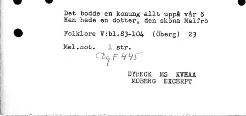 //// Det bodde en konung allt uppå vår ö //// Han hade en dotter, den sköna Malfrö //// # Folklore V:bl.33-104 (Öberg) 23 //// Mel.not. 1 str. //// f i V: //// DYBECK MS KVHAA //// MOBERG EXCERPT ////