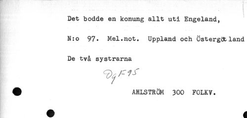 //// E - - ' ^ //// Det bodde en konung allt uti Engeland, //// . - . .. ... //// N:o 97* Mel.not. Uppland och Östergötland //// De två systrarna //// # AHLSTRQM 300 FOLKV. ////
