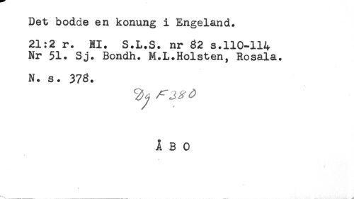 //// Det bodde en konung i Engeland. //// 21:2 r. Hl. S.L.S. nr 82 s.110-114 //// Nr 51. Sj. Bondh. M.L.Holsten, Rosala. //// N. s. 378. //// ÅBO ////