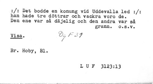 //// :/: Det bodde en konung vid Uddevalla led :/: //// han hade tre döttrar och vackra voro de. //// Den ene var så däjelig och den andra var så //// grann, o.s.v. //// Visa. % / J? //// Br. Hoby, Bl. //// L U F 3123:13 ////