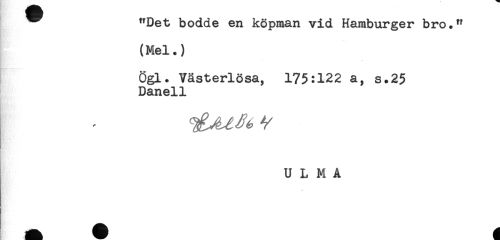 //// ^ "Det bodde en köpman vid Hamburger bro." //// (Mel.) //// Ögl. Västerlösa, 175:122 a, s.25 //// Danell //// U L M A ////