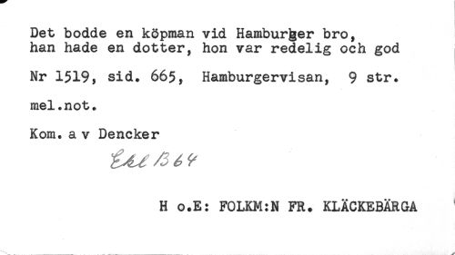 //// Det bodde en köpman vid Hambur&er bro, //// han hade en dotter, hon var redelig och god //// Nr 1519, sid. 66$, Hamburgervisan, 9 str. //// mel.not. //// Kom. a v Dencker //// H o.E: FOLKM:N FR. KLÄCKEBÄRGA ////