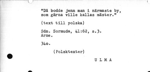 //// "Dä bodde jenn man i närmaste by, //// som gärna ville kallas mäster." //// (text till polska) //// Sdm. Sormuda, 41:62, s.3* //// Arne. //// 34o. //// (Polsktexter) //// ^ U L M A ////