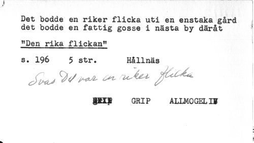 //// Det bodde en riker flicka uti en enstaka gård //// det bodde en fattig gosse i nästa by däråt //// "Den rika flickan" //// s. 196 5 str. Hållnäs //// ^ Sv ^ ^ ' //// gRip GRIP ALLMOGELI? ////
