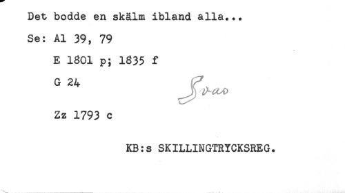 //// Det bodde en skälm ibland alla... //// Se: Al 39, 79 //// E 1601 p; 1335 f //// G 24 (r^ //// Zz 1793 c //// KB:s SKILLINGTRYCKSREG. ////